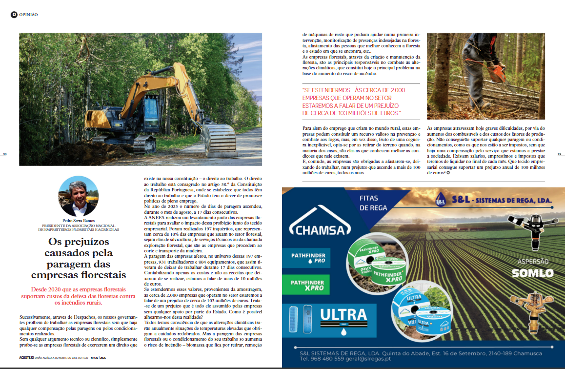 A ANEFA disponibiliza o artigo de opinião do seu Presidente, publicado na Revista Agrotejo, dedicado a um tema de grande atualidade e impacto para o setor: os prejuízos resultantes da paragem das empresas florestais.